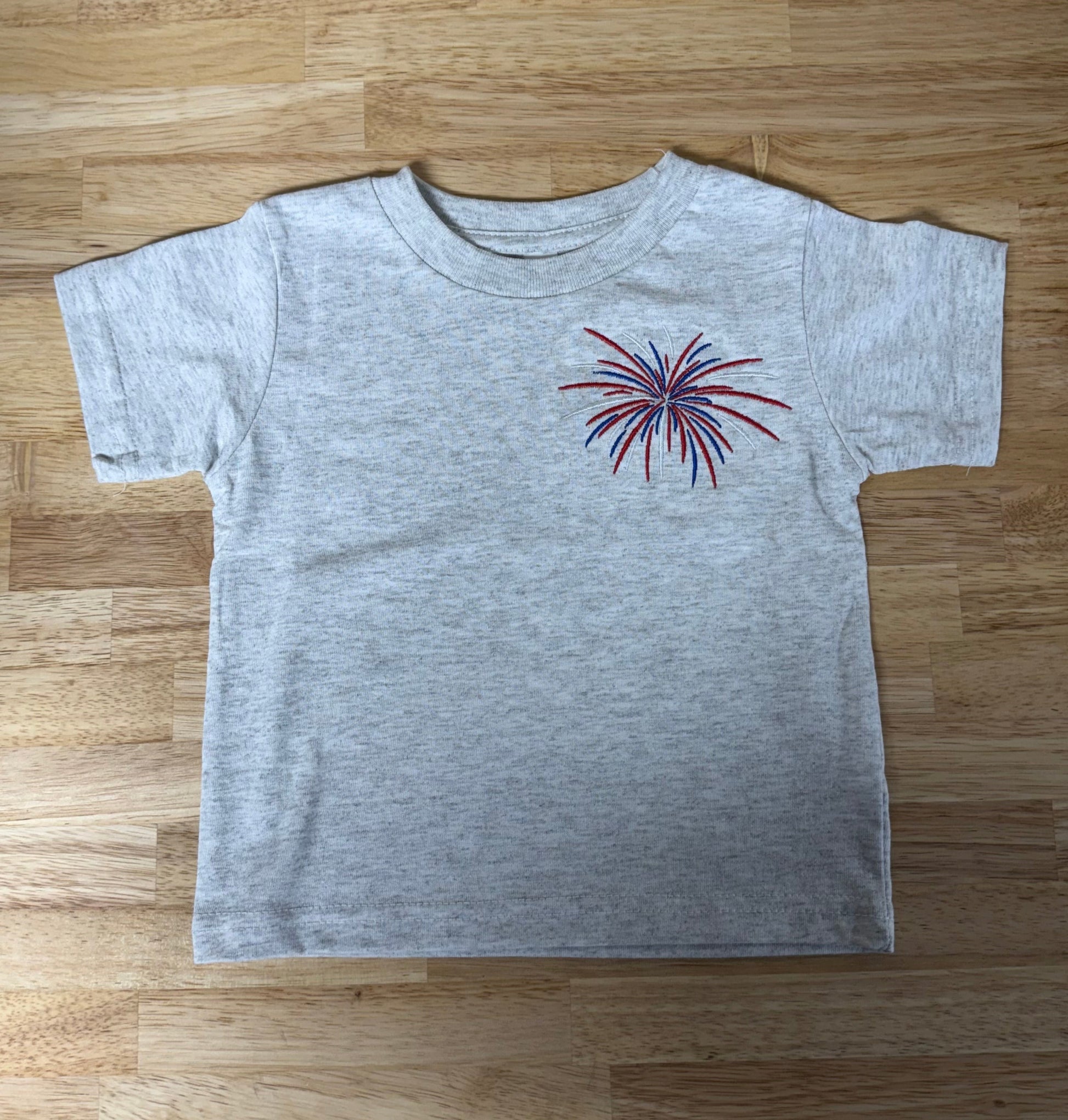 - Infant and Toddler Firework T-shirt (ash gray with red, white, and blue thread)